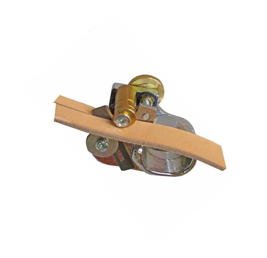 Denne reimskjæreren er meget liten og hendig. Kraftig og god kvalitet. Den kan også justeres under skjæringen slik at reimen du lager kan bli gradvis smalere og smalere.