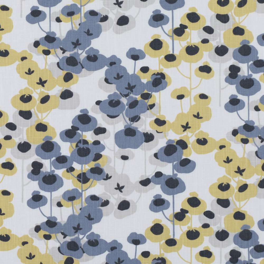 Lyst stoff med blå og gule blomster.