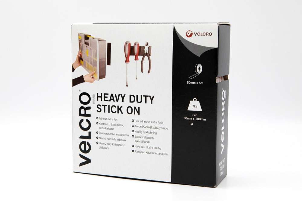 Heavy Duty – Borrelås med ekstra sterk lim! Enkel å bruke som et alternativ til skruer, nåler, lim og tape. Tåler opp til 7 kg ved bruk av 10 cm borrelås. Leveres komplett med hard og bløt del, 5 m i boksen. Må ikke brukes på tekstiler, PVC og tapeter.