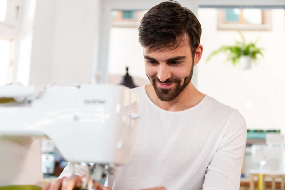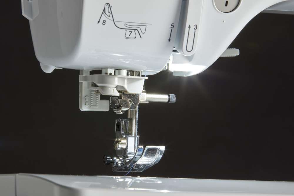 De 16 forhåndsinnstilte sømmene kan enkelt velges på det elektroniske funksjonshjulet på denne maskinen. Det automatiske gjengesystemet gjør treing mye enklere.