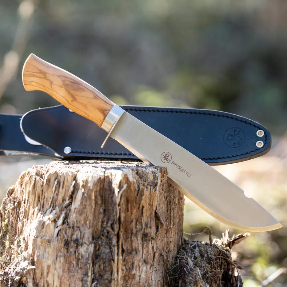 Villmarka stor har et blad med Skandinavisk slip og holk i rustfritt stål. Det gir det tradisjonelle skaftet den ekstra styrken kniven trenger når den blir brukt til å hugge med. Knivbladet har vår signatur; halvmånehakket i ryggen – for å løfte kaffekjelen av bålet. Kniven har et skaft i oliventre og fingervern.