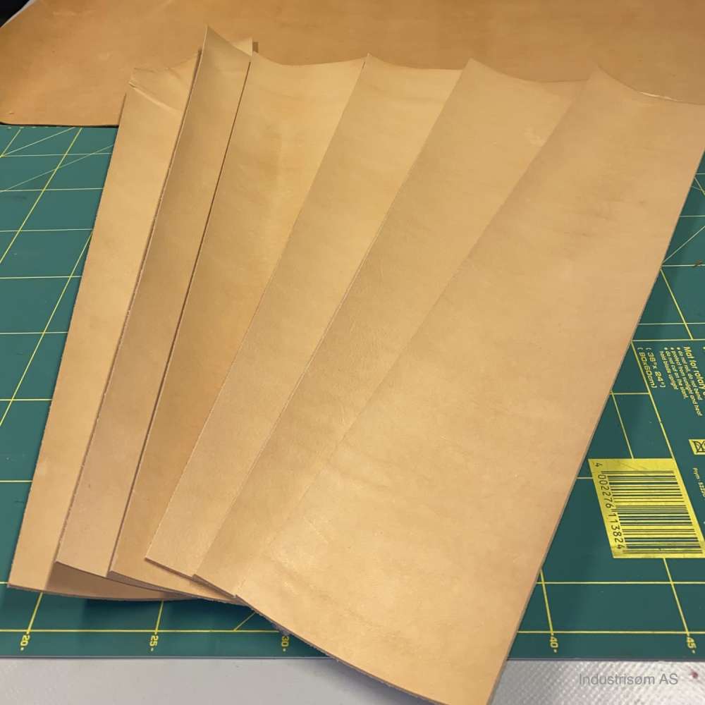 Hempelær til knivslirer. Stropp/hempe/oppheng. Læret skjæres i remser på 10cm og er ca 50cm lange. Normal lengde på stropper er innenfor 10cm og det er derfor tilpasset strekkretning på læret.