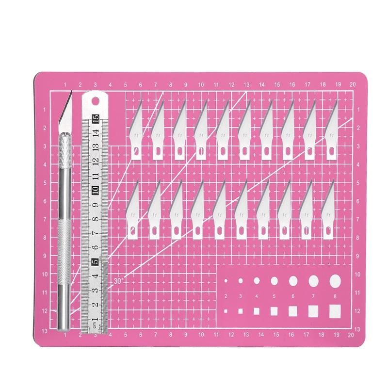 Fin pakke med en powerkniv, 20 knivblad, skjæreunderlag A5 og 15cm linjal i stål. Perfekt til småarbeid med knivslire, lommebok, kortholder eller andre prosjekter. Kniven egner seg til tynnere og myke materialer som papir, kartong, linoleum, PU leather, tynt skinn og pels. Skjærematten passer også meget godt til 28mm rullekniv. Linjalen er av stål, som gjør den meget holdbar og sikrer deg mot kutt.
