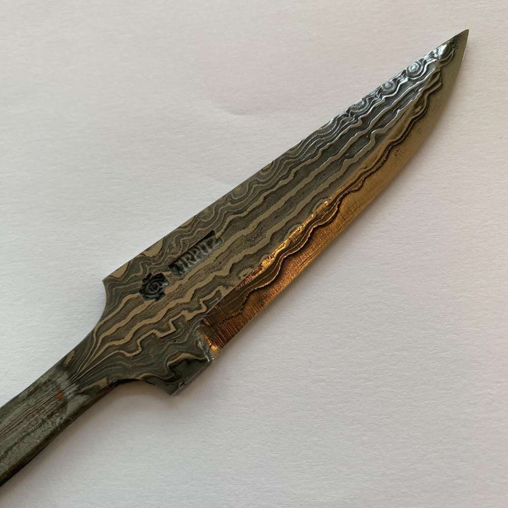 Håndsmidd damask knivblad med stål fra slagskipet Tirpitz. Det er stål fra dørkplater og kjettingstål som er brukt til dette bladet, sammen med nytt høykvalitets eggstål.