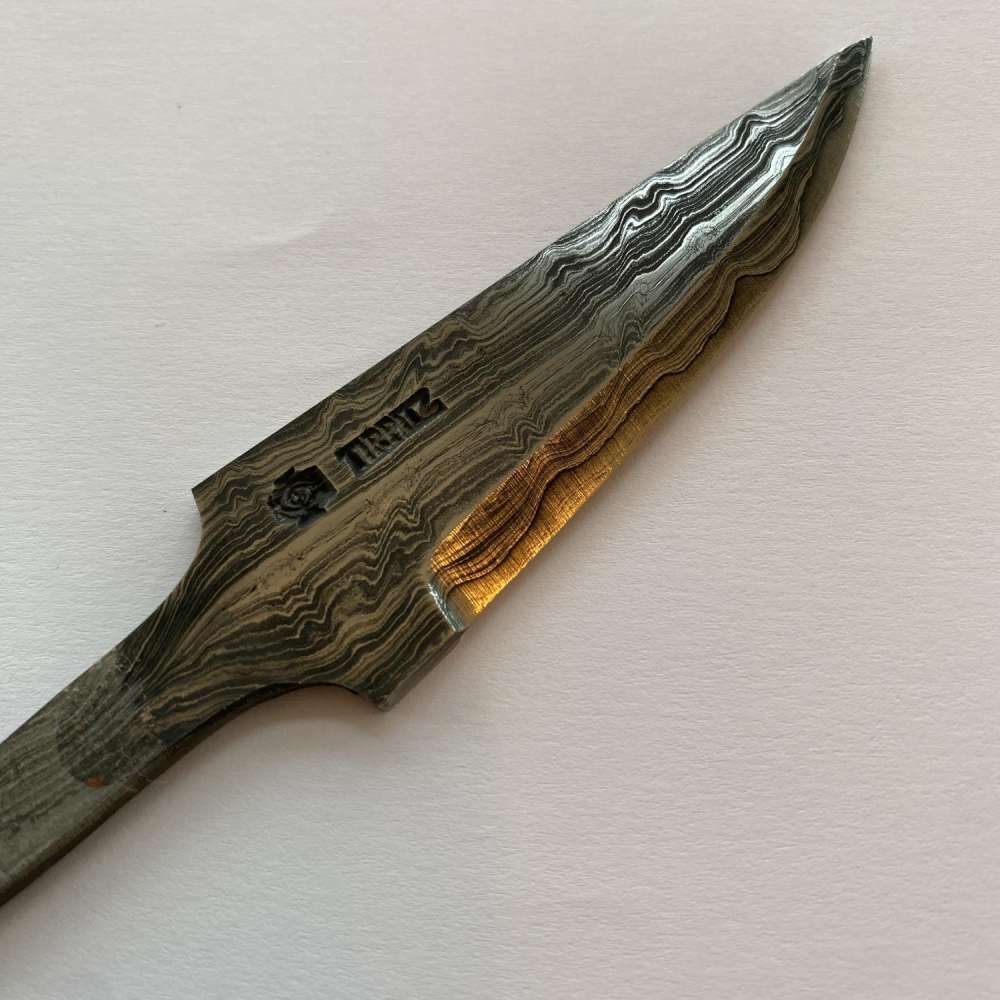 Håndsmidd damask knivblad med stål fra slagskipet Tirpitz. Det er stål fra dørkplater og kjettingstål som er brukt til dette bladet, sammen med nytt høykvalitets eggstål.