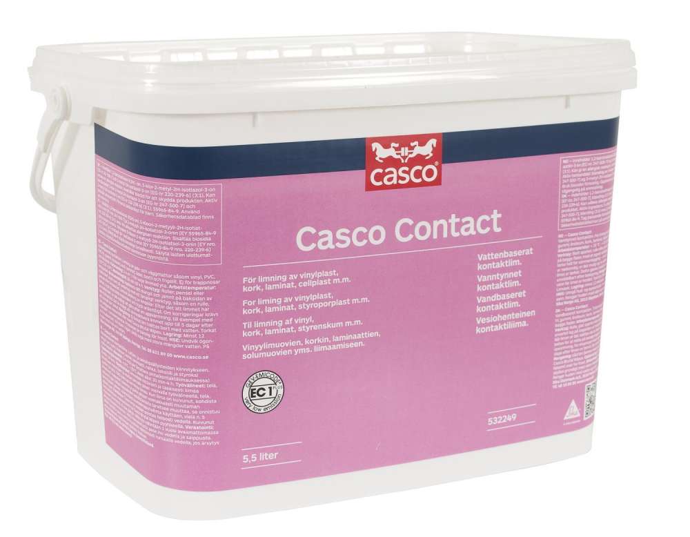 Casco Contact 3880 är ett vattenbaserat kontaktlim som som passar för limninga av de flesta typer av material, t ex läder, textila material, vinyl, plast, papp, laminat, kork och cellplaster.