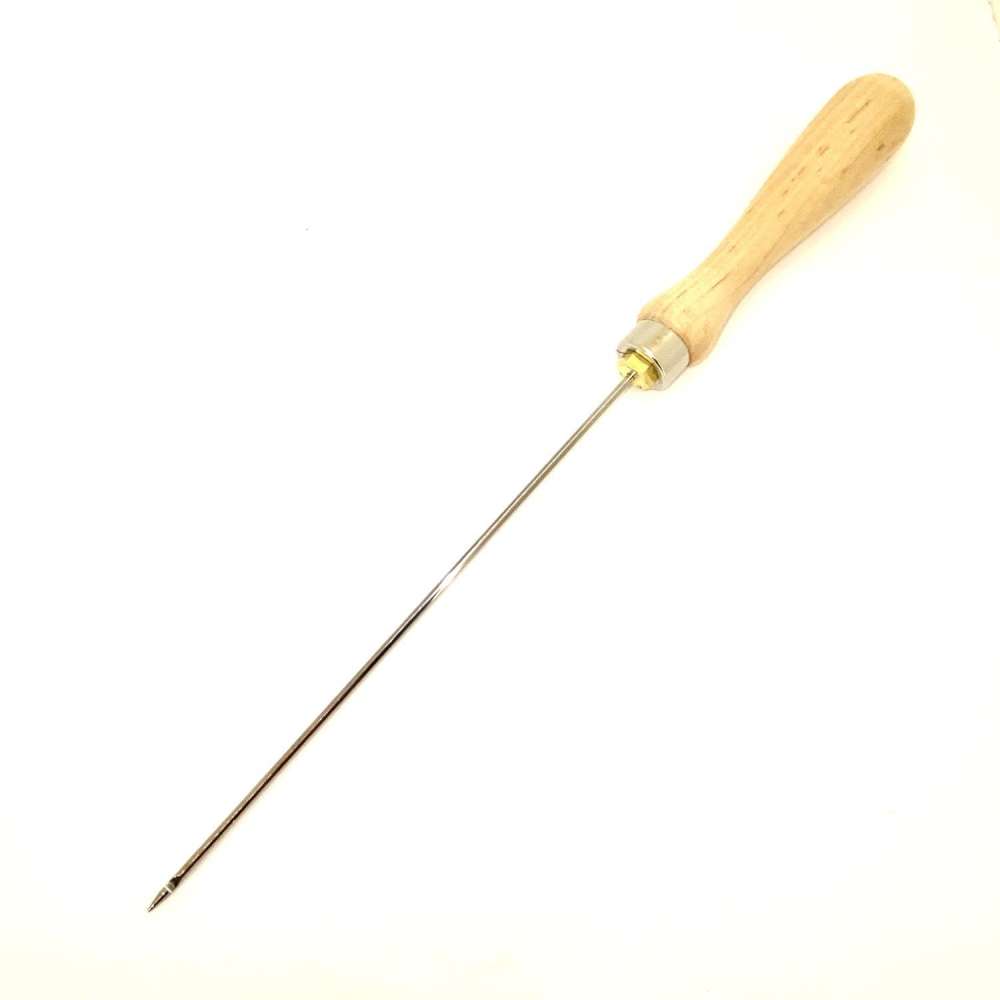 Loopsnål med trehåndtak for å trekke knappetråder (loops) gjennom puter og møbler.