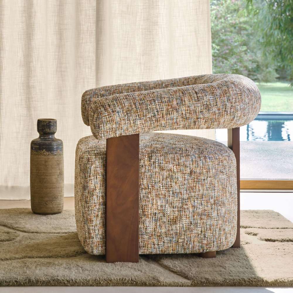 Teksturert tweed med en naturlig og livlig karakter – «MERAPI» er et tweed-look stoff vevd med flammende, flerfargede chenillegarn, som skaper volum, tekstur og en subtilt uregelmessig finish som forsterker dens rå, naturlige sjarm.