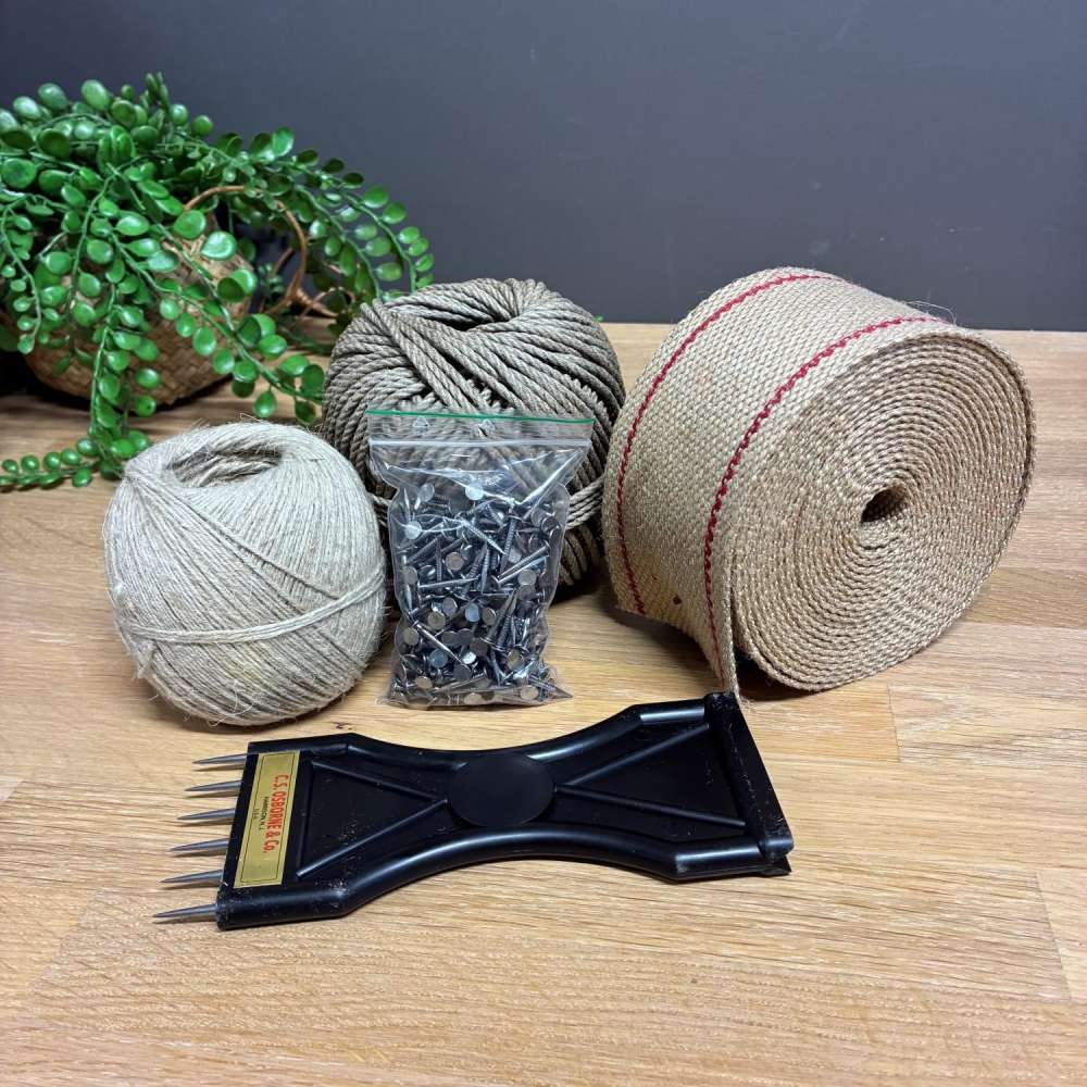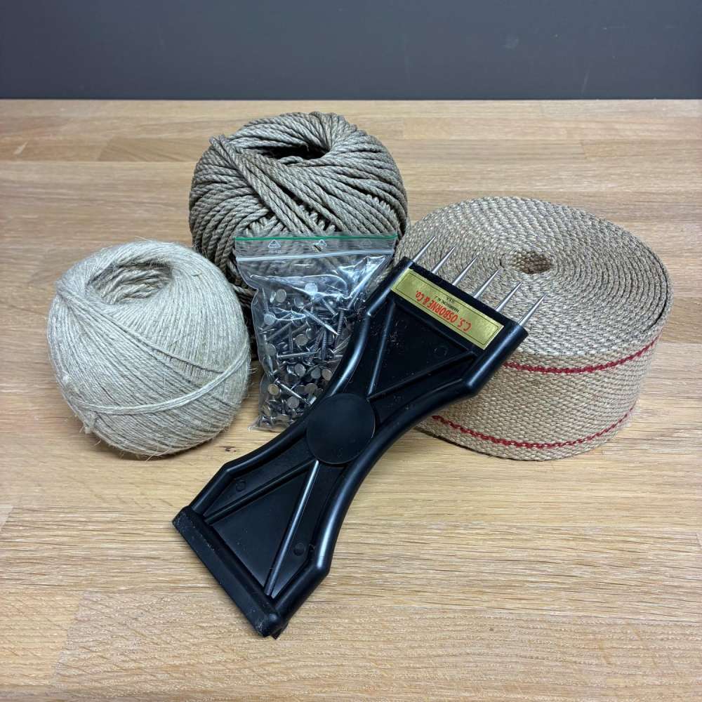 Møbeltapetsering Startpakke M4 er en materiellpakke for tradisjonell stopping der du skal stramme gjordebånd og knyte fjærer. Den er laget for fjørknyting, og gir deg både strammeverktøyet og forbruksmateriellet som faktisk brukes i jobben.