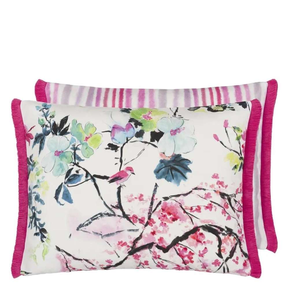 This large rectangular indoor/outdoor cushion features a printed canvas created for outdoor use but also incredibly practical for the inside! Delicate Chinoiserie flower paired with Palasari outdoor in peony and finished with a brushed fringe trim in flamingo pink, created for outdoor use. Care should be taken to dry out the cushion and pad should it get soaking wet and water logged.